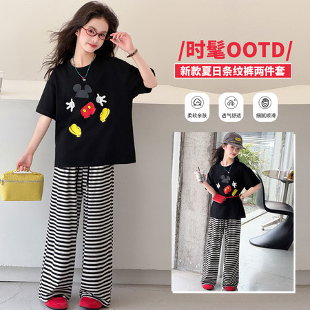 漂亮优贝童装&2956款卡通米奇短袖条纹阔腿裤