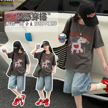 森林公主&85143款灰色爱心马T恤牛仔中裤套装