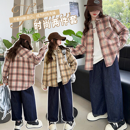 薇美&2607款卫衣拼接格子牛仔裤套装
