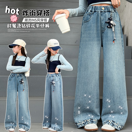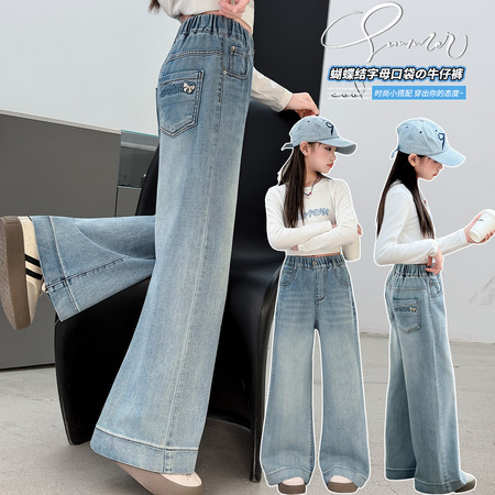 ¥38分销数 200+一朵一果&26017烫花元宝牛仔裤女童春秋牛仔阔腿裤2026新款中大童百搭高腰长裤春季弯刀裤带爆【闪】