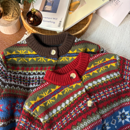 ¥45分销数 60+哆唻格&DLG-D02平拍图 男童女童加厚提花高领费尔岛钉扣套头毛衣 个性时尚潮