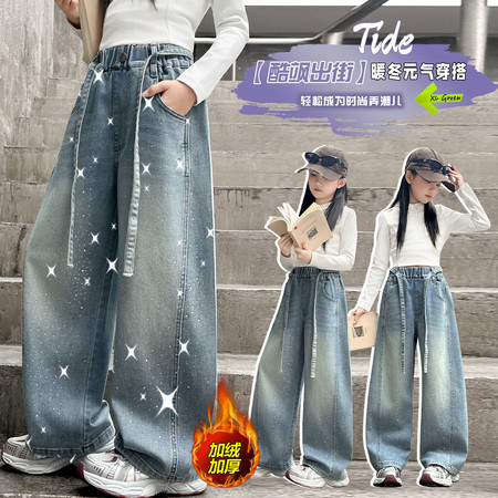 女童拉条加绒卫衣毛脚口加绒牛仔裤套装闪【闪】 -