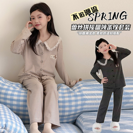 26新款春款德绒条纹蕾丝花边睡衣居家服