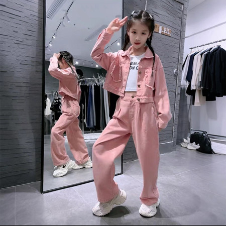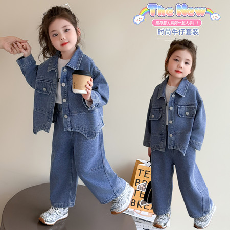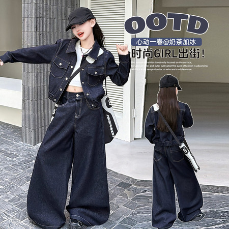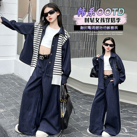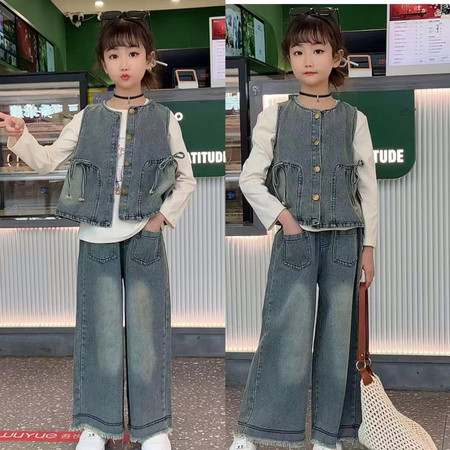 (可以开增值税票)现货女童中大童新款牛仔套装三件套拉绳软牛仔