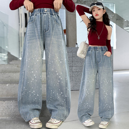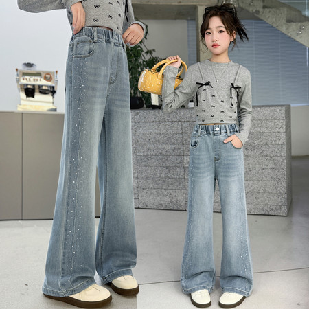 广州牛仔,现货女童牛仔裤春装2026拼接烫钻蝴蝶结阔腿裤