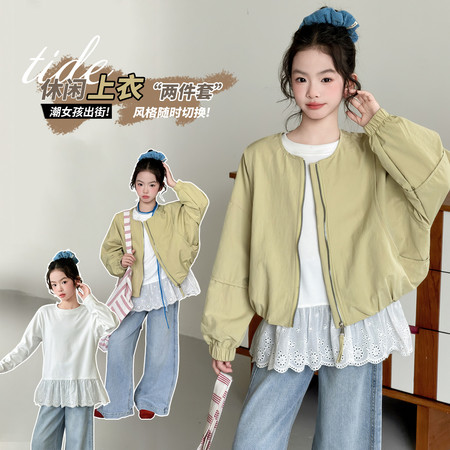 2026春款上新 水洗棉纯色拼接外套 花边打底衫